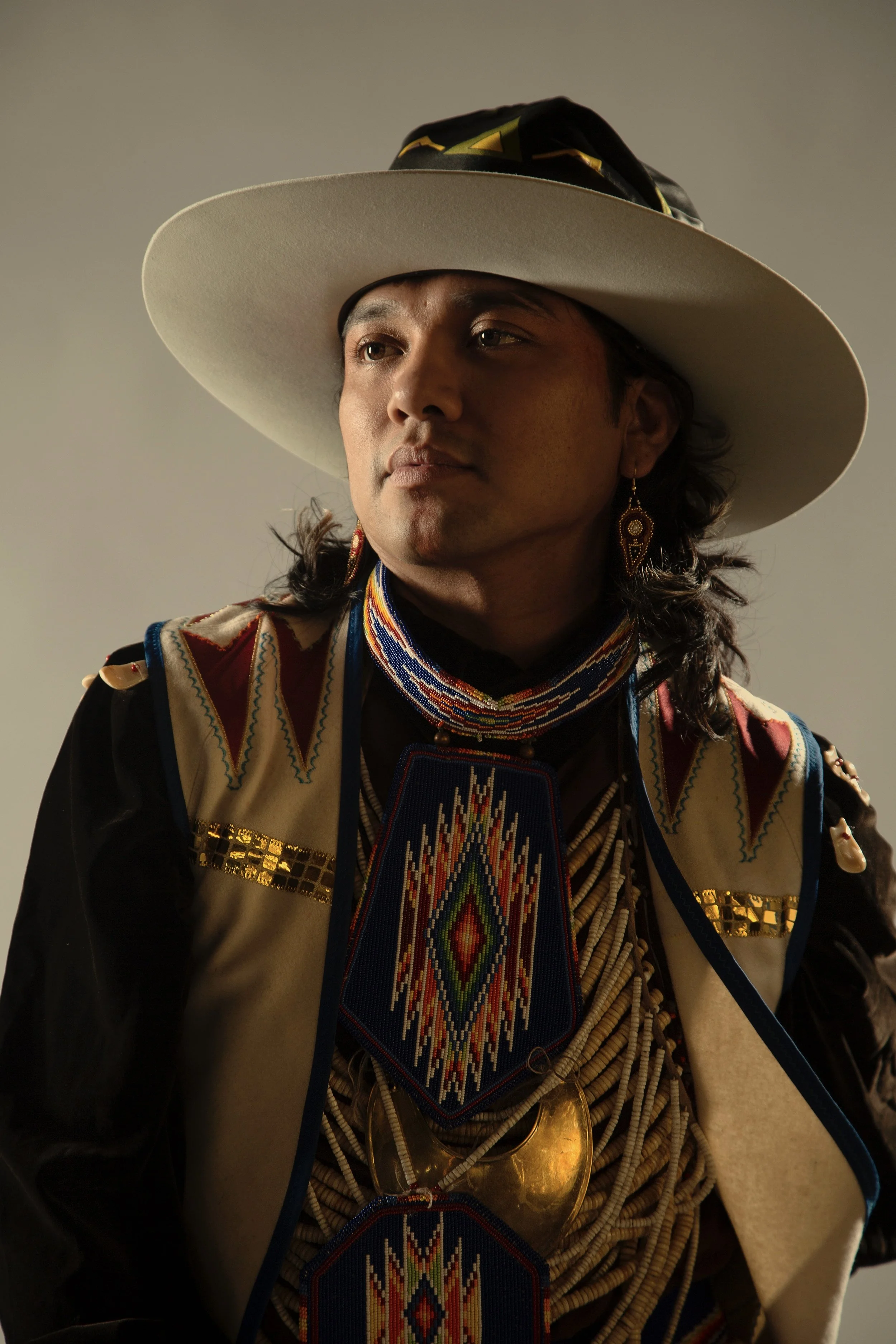 Eian Sundust Stevens, raised on the Uintah & Ouray reservation in Fort Duchesne Utah, is an artist residing in Santa Fe, New Mexico. His artistry is rooted deep in powwows, The Dancers and their Regalia, and his distinctive beadwork often showcases the vibrant colors and intricate patterns characteristic of Northern Ute and Shoshone designs. Nearly all of his work is intuitive in that designs are not predetermined but develop as the work develops. Strict use of Brain-tanned and smoked Buckskin for the base and backing is primarily used; sourced from relatives in Fort Hall, Idaho are priority in Sundust’ work. Exclusive use of size 13/00 cut Charlotte beads alongside size 13/00 24kt gold plated beads and 18kt Gold filled beads adorn nearly all work.