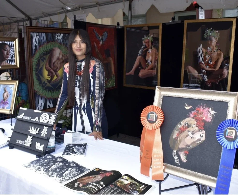 Tse Tsan, a Santa Clara Pueblo artist, creates work that exists at the intersection of tradition and digital innovation. Through the medium of digital surrealism, she explores layered themes of identity, femininity, and the natural world, merging Pueblo design motifs with contemporary imagery in ways that challenge and expand conventional views of Indigenous art.